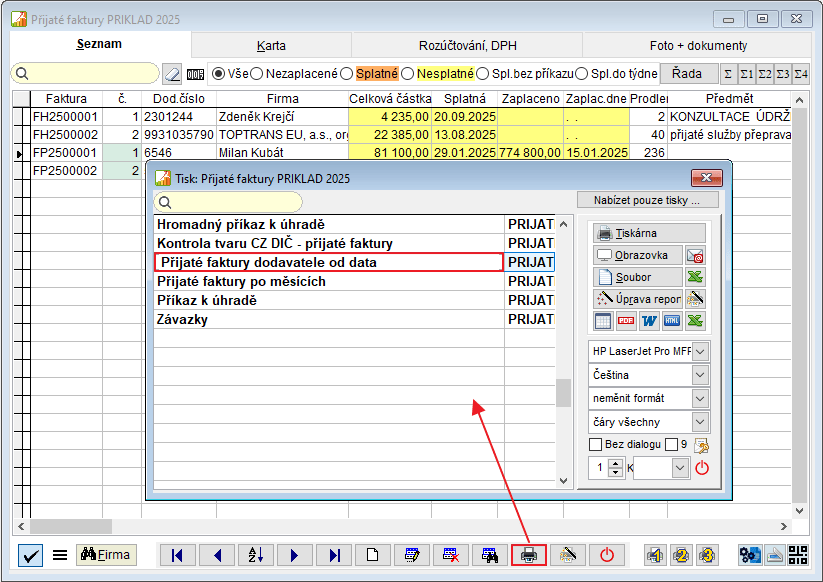 V horní části je filtr na firmu (při spuštění tisku vyplněn podle faktury, ze které byl tisk spuštěn).