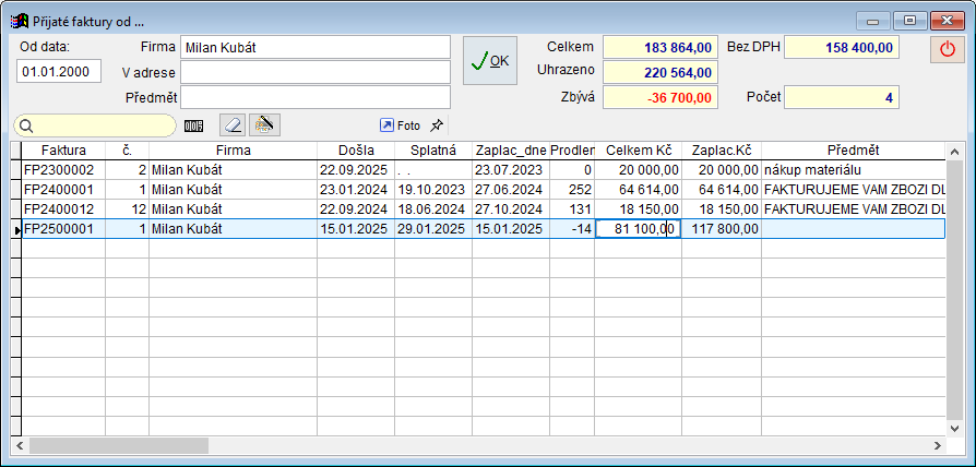 Tisk přijatých faktur dodavatele od data umožňuje rychle zjistit, kolik vám konkrétní dodavatel celkem vyfakturoval, kolik už bylo uhrazeno a jaká částka zbývá k úhradě. Seznam faktur si můžete jednoduše filtrovat od zvoleného data a mít tak okamžitý přehled o celé spolupráci s daným dodavatelem. U každé faktury lze zobrazit podrobnosti a pokud máte k dokladům uložené elektronické přílohy (záložka Foto + dokumenty), snadno si je otevřete v náhledu přímo ze seznamu.