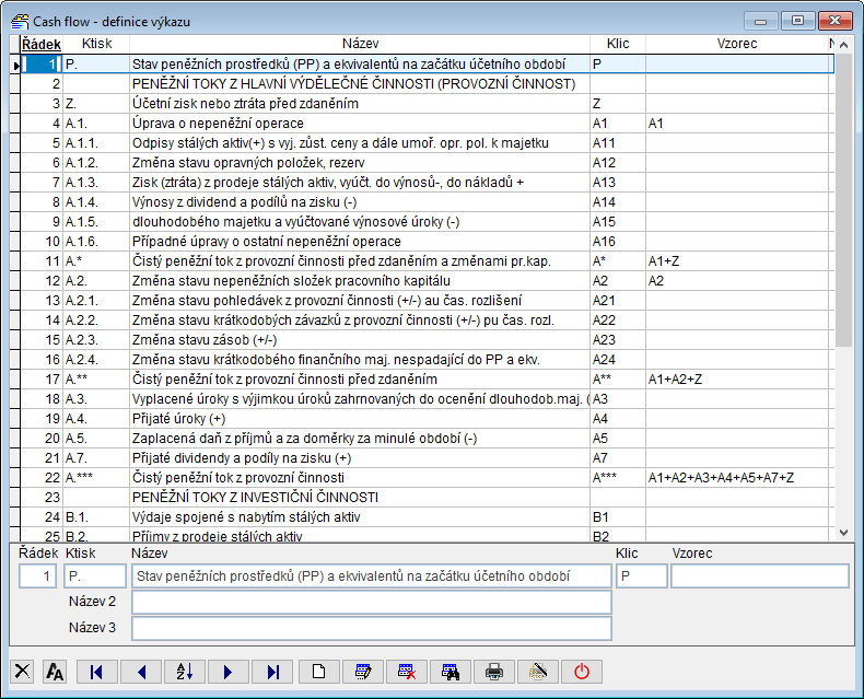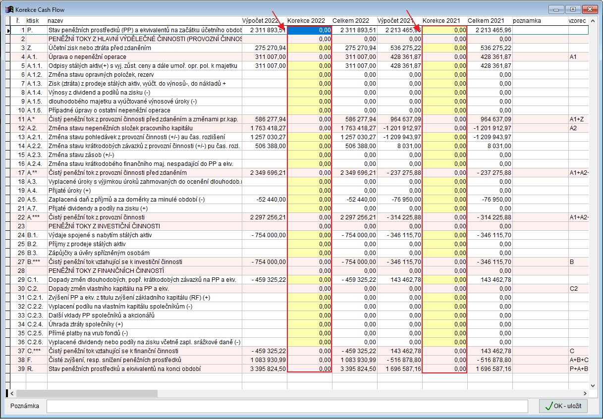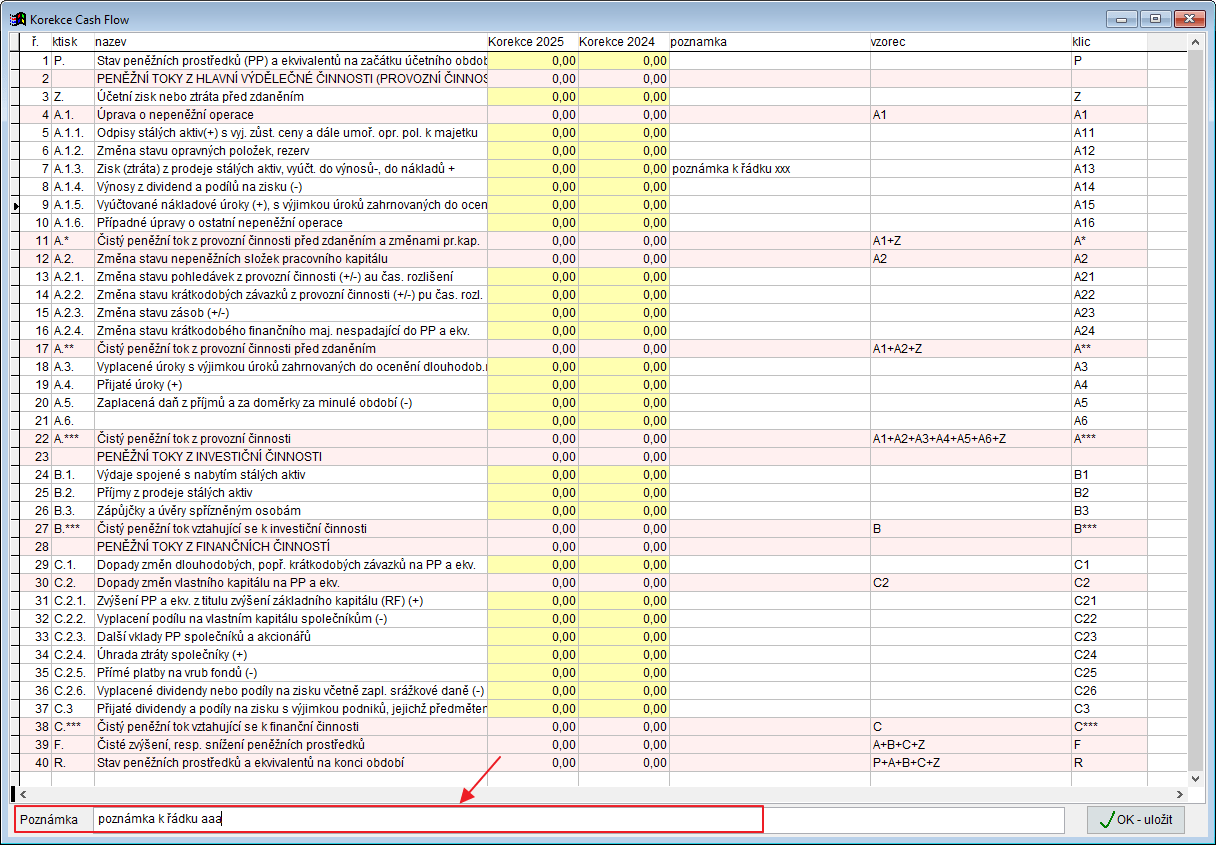 Výkaz CF s poznámkami - formulář CF na šířku s poznámkou k řádku výkazu, kterou si můžete zapsat při zadávání korekcí (tlačítko , označte řádek a poznámku zapište dole ve formuláři)