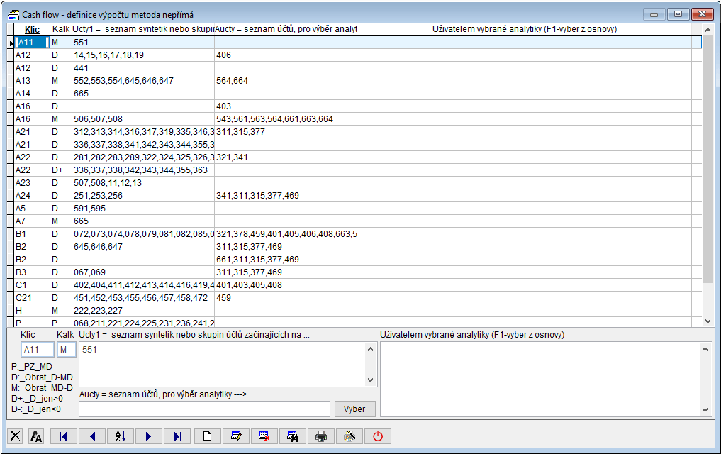 Kontrola: přidělení účtů - seznam všech účtů z účetní osnovy s klíči do výkazu CF