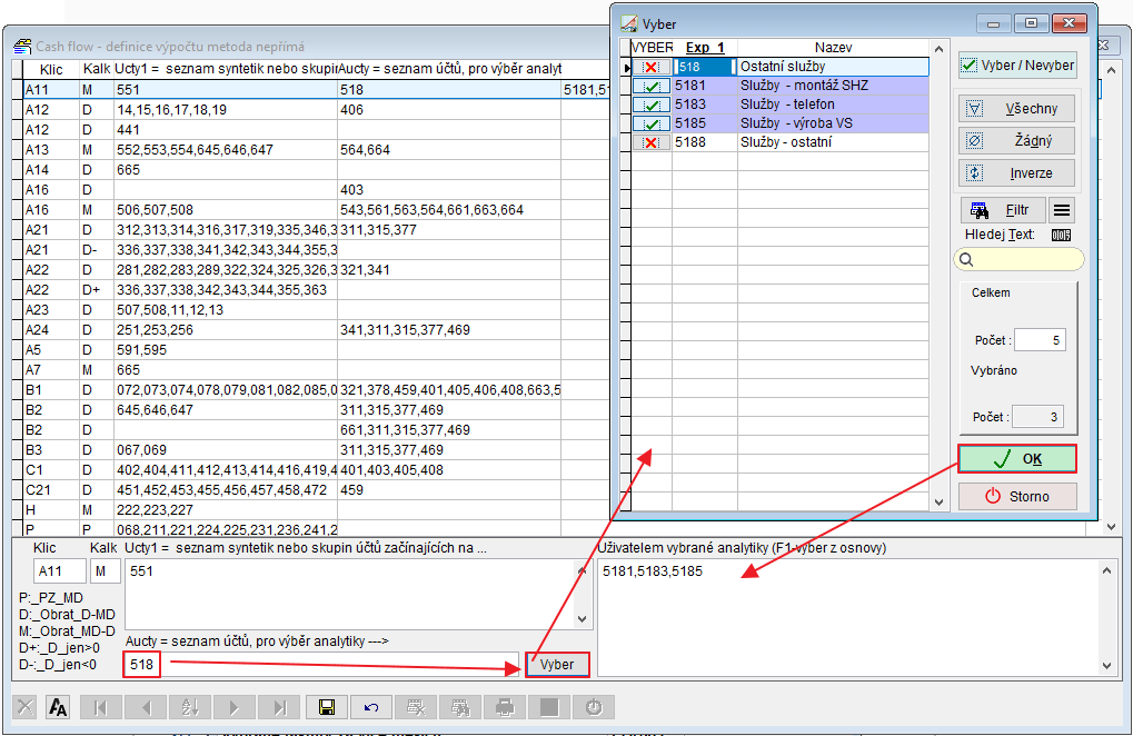 Pokud se různé analytiky daného účtu vyplňují do různých řádků výkazu, pak je k příslušnému klíči (řádku výkazu) vyplňte do pole Aucty -> tlačítko Vyber nabídne analytiky daného účtu z účetní osnovy -> Ok zapíše vybrané účty s příslušnými analytikami do pole Uživatelem vybrané analytiky viz obrázek