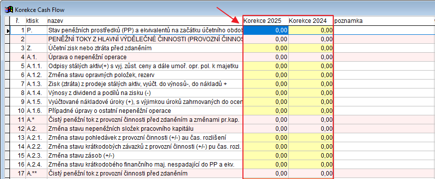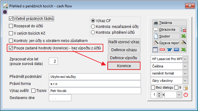• V nabídce Tisky › Přehled o finančních tocích – CASH FLOW zaškrtněte „Pouze zadané hodnoty (korekce) – bez výpočtu z účtů“.