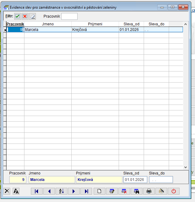 V následné evidenci je možné vložit záznam pro konkrétního pracovníka (pracovní poměr) kde se uvede od jakého datumu se bude tato sleva uplatňovat.