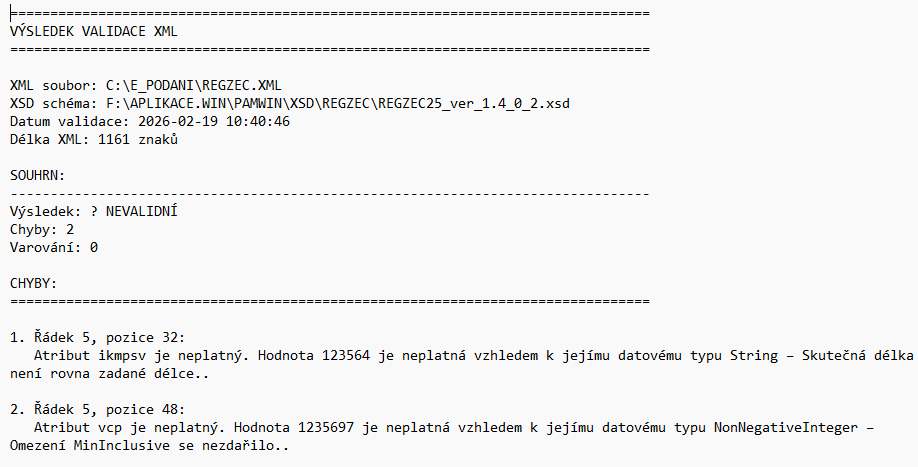 Případně je možné zapnout volbu (x)Podrobný protokol a potom se ještě zobrazí detailní popis jednotlivých chyb, který je možné prohlížet v textovém editoru