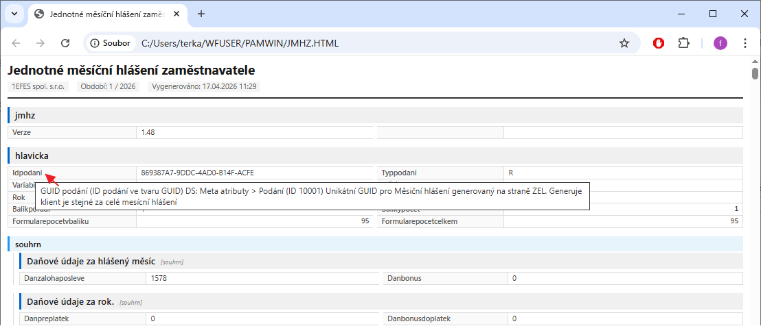 Před odesláním jakéhokoliv XML souboru (JMHZ i Registrace) nabízí program funkci „Kontrola XML“. Ta soubor neotevře jako surový kód, ale jako přehledný HTML opis s následujícími funkcemi: