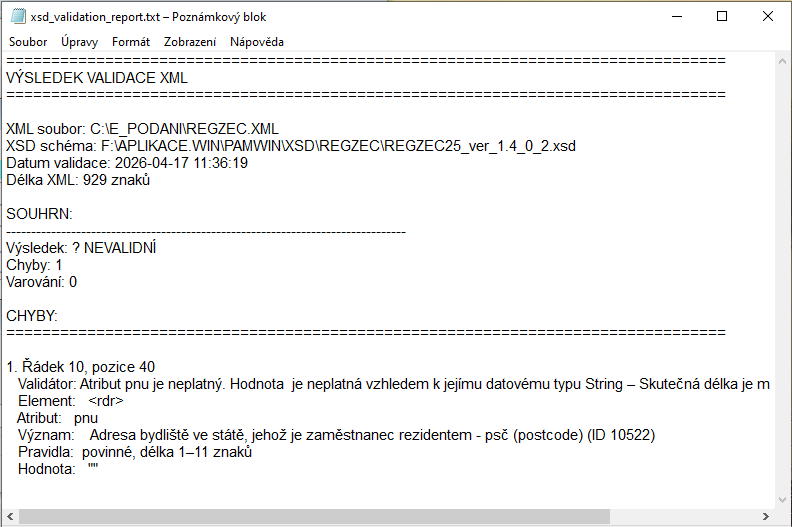 Upozornění: Tato kontrola prověřuje shodu se strukturou definovanou v XSD souboru (povinná pole, formáty). Další věcné a logické kontroly však mohou probíhat až na straně přijímacího serveru ČSSZ.